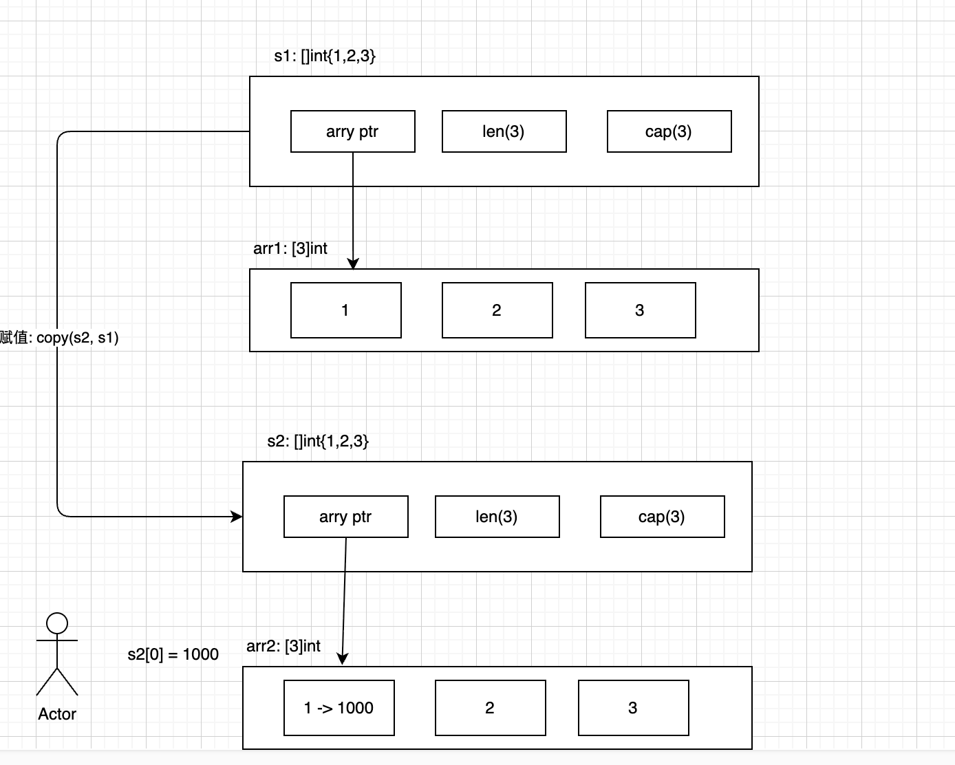 feat(slice): 添加切片详细示例和图片资源 - 在README.md中添加image-2.png、image-3.png、image-4.png图片引用, 用于说明切片操作的可视化内容 - 将"通过切片创建新的切片"章节内容重新排序至切片拷贝部分之后 - 在main.go中增加多种切片声明方式的代码示例 - 补充切片访问、遍历、引用类型特性、深拷贝等完整示例 - 添加append.drawio和ref.drawio绘图文件,提供切片操作流程图 ```